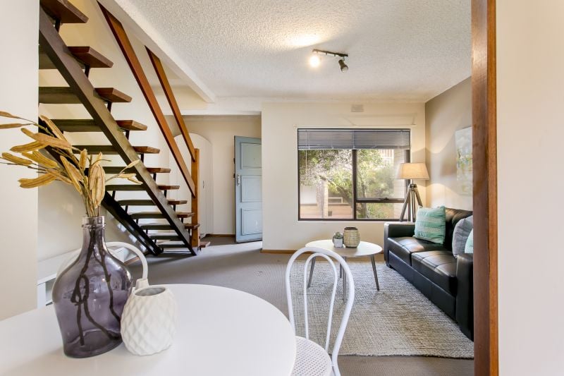 Perfectly positioned at the rear of the group, this two bedroom townhouse is spacious and well appointed. Entering into the generous sitting room which flows into the well equipped kitchen with views over the rear courtyard garden. Upstairs features two bedrooms, master with built-in robes. The bathroom has been updated and in addition there is a second guest w.c. downstairs.