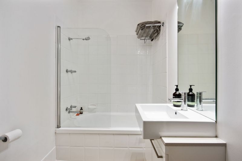 Sparkling white bathroom with shower over bath, single vanity and toilet, plus a separate laundry cleverly hidden behind bi-fold doors.