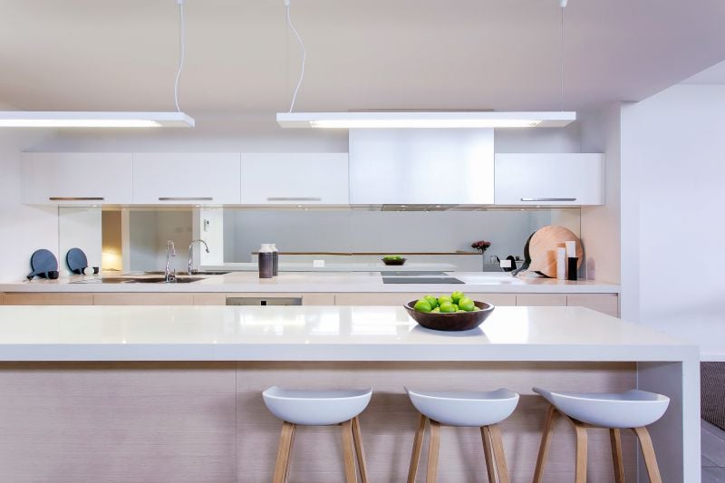 Timber veneer kitchen with Caesar stone bench top with mirror splash back and Caesar stone on island bench