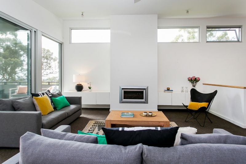Escea Gas log fire set in Chimney with floating joinery unit either side