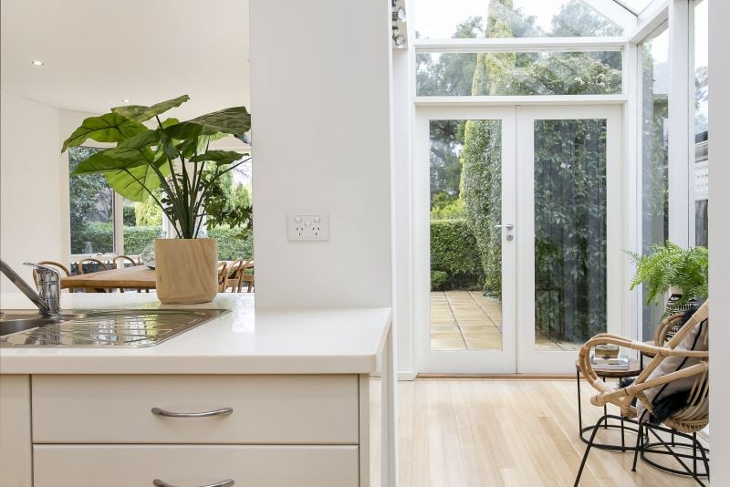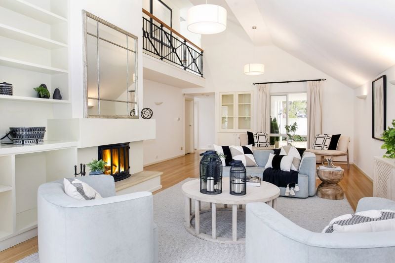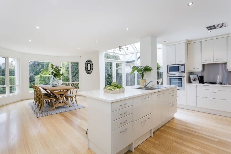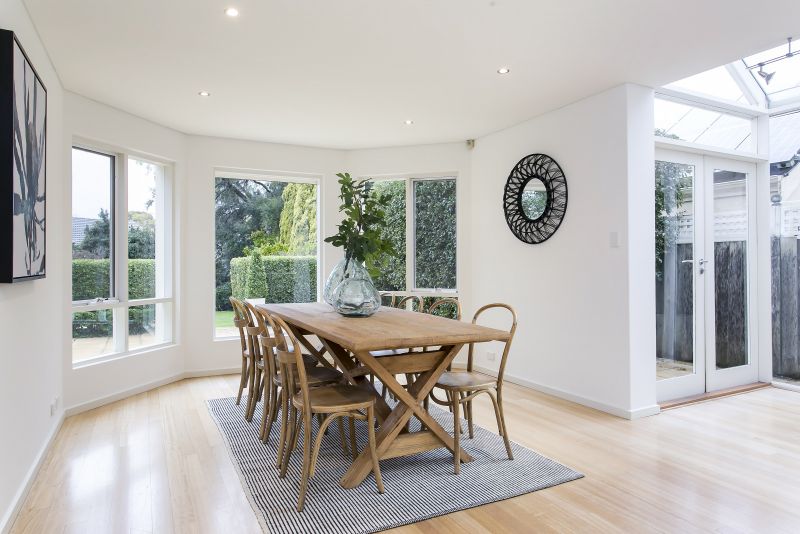 Lower level comprising of spacious living and dining with combustion fireplace, solid Tasmanian oak flooring, vaulted cathedral ceilings, French doors leading out to the alfresco entertaining area and sunken private garden and lawns plus contemporary open plan kitchen, informal dining and breakfast atrium plus third bedroom or study/office.