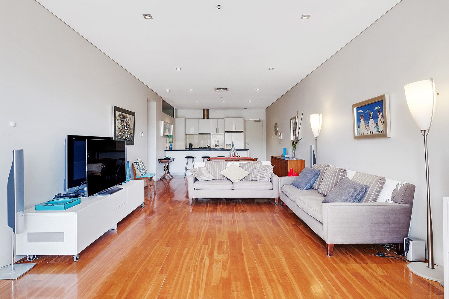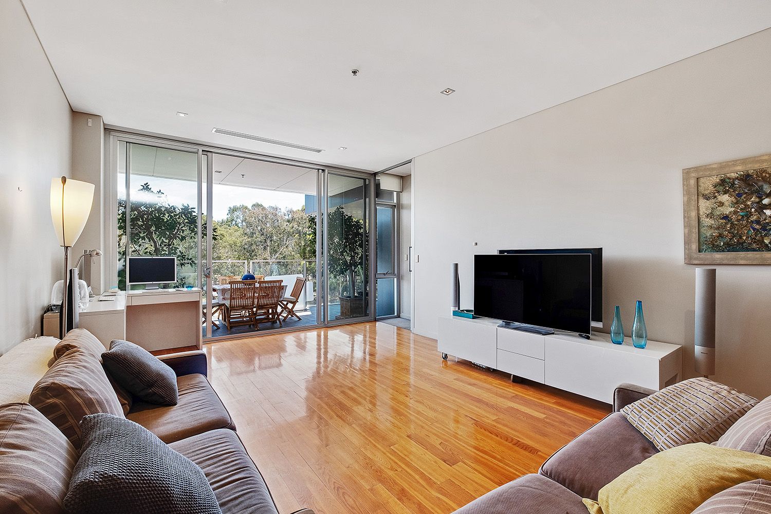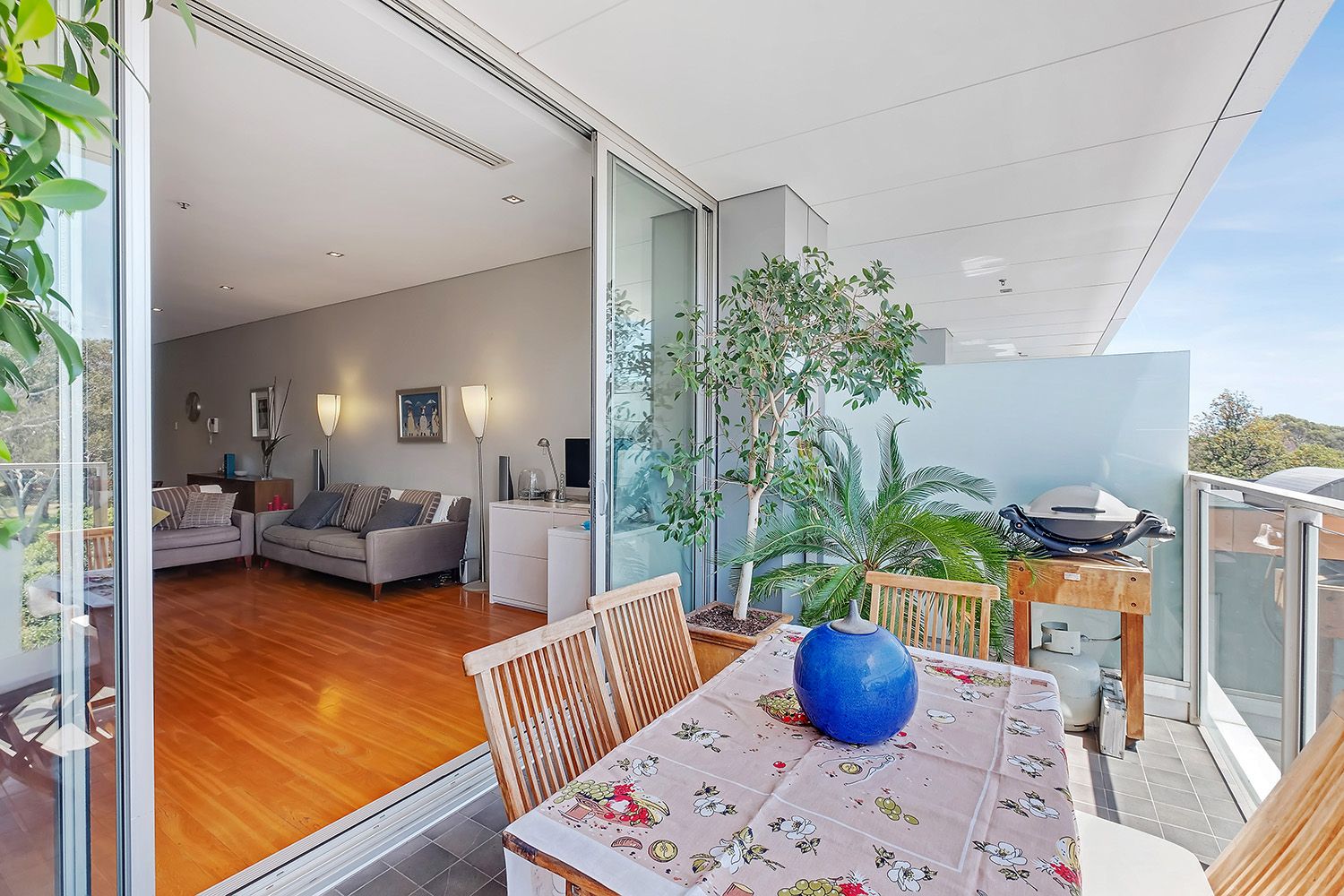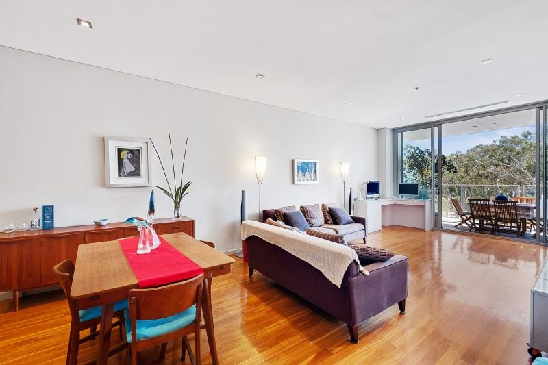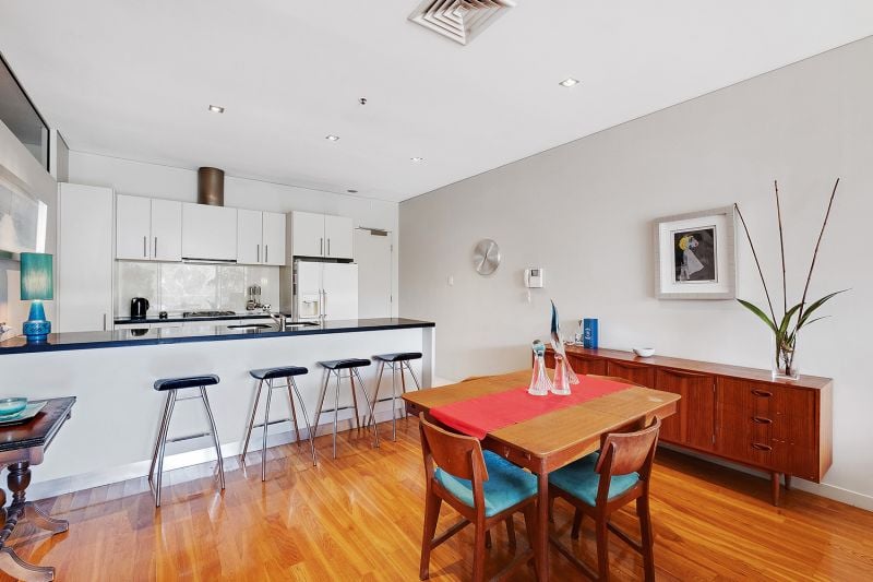 Featuring rich polished timber flooring flowing through the open plan dining and living areas. Sunlight floods through the north-facing floor to ceiling glass doors, allowing for minimal use of heating during the winter months, leading on to your private terrace, stretching the width of the home. Visualise balmy summer dinners or watching a storm roll over!