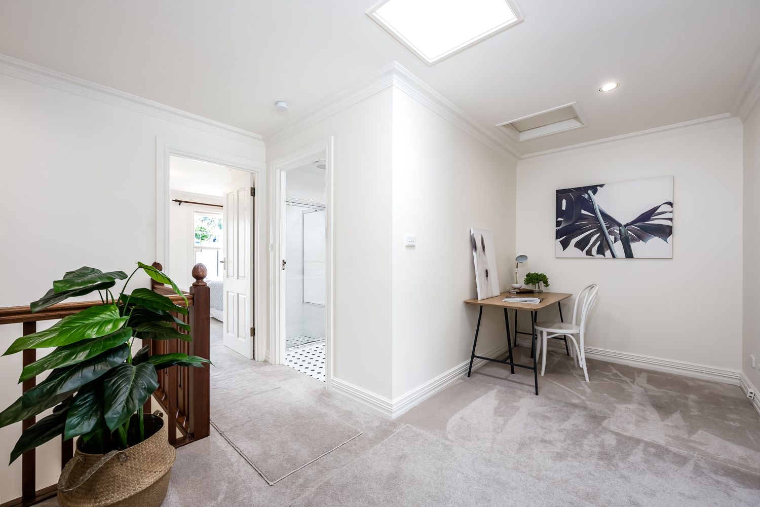 Upstairs are three double bedrooms, master with extensive built-in-robes and French doors to the large balcony. The family bathroom is modern and offers separate shower and bath. In addition is a study area, second large bedroom with built-in-robes and third bedroom.