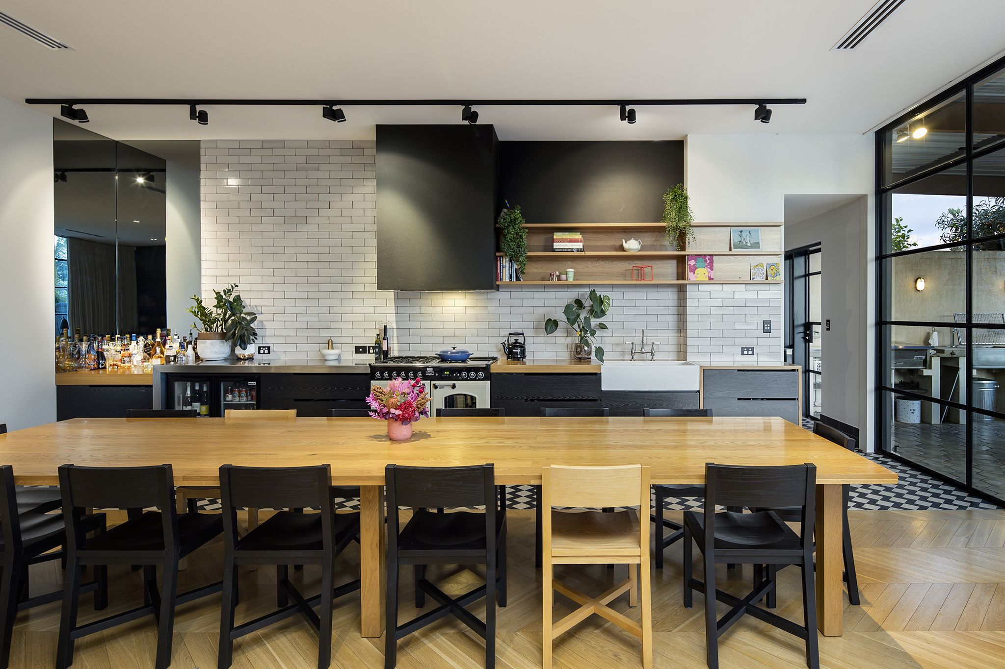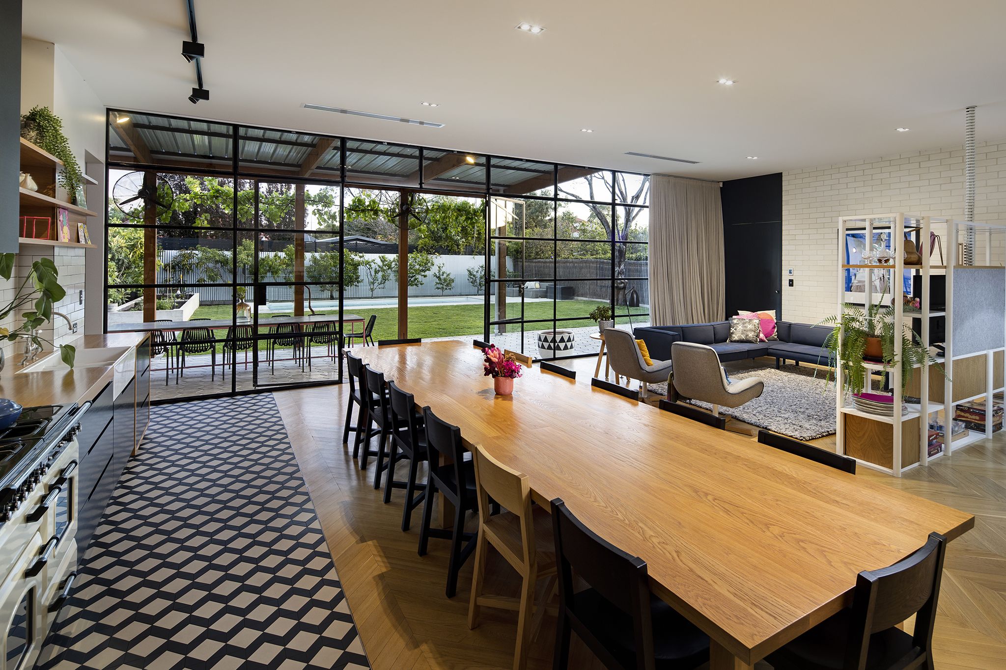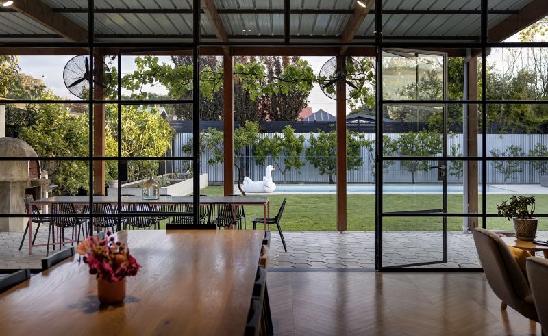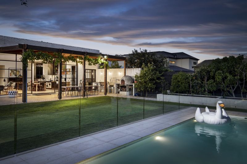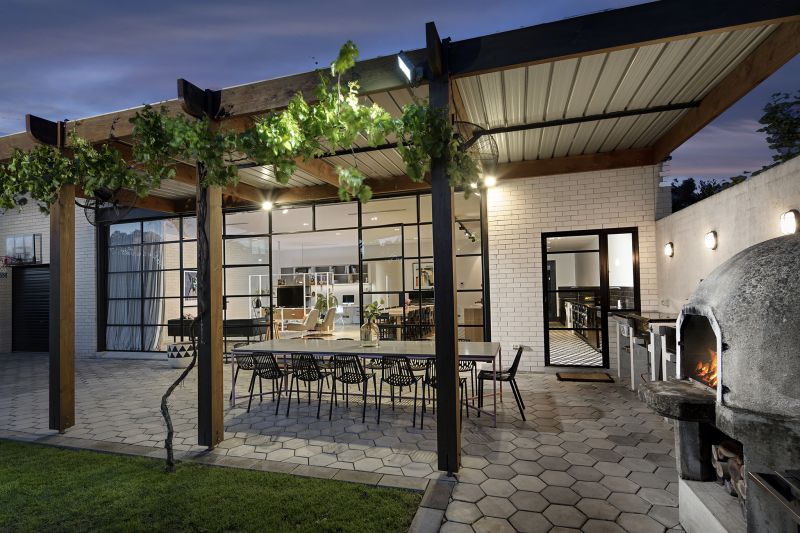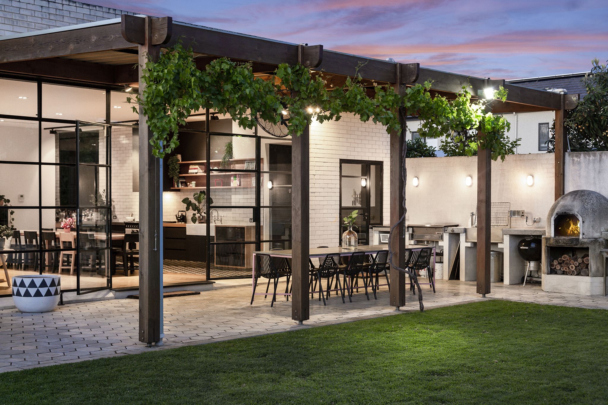 Custom black steel glazing floods this area with natural light and opens out to create a seamless flow for indoor and outdoor living. The vine covered pergola is well serviced by built-in rotisserie and gas plate BBQ plus wood pizza oven is yours to enjoy while overlooking the in-ground solar heated mineral pool.