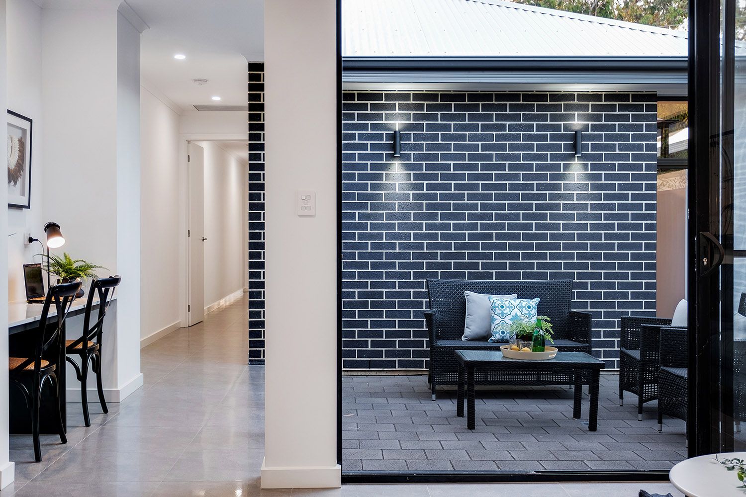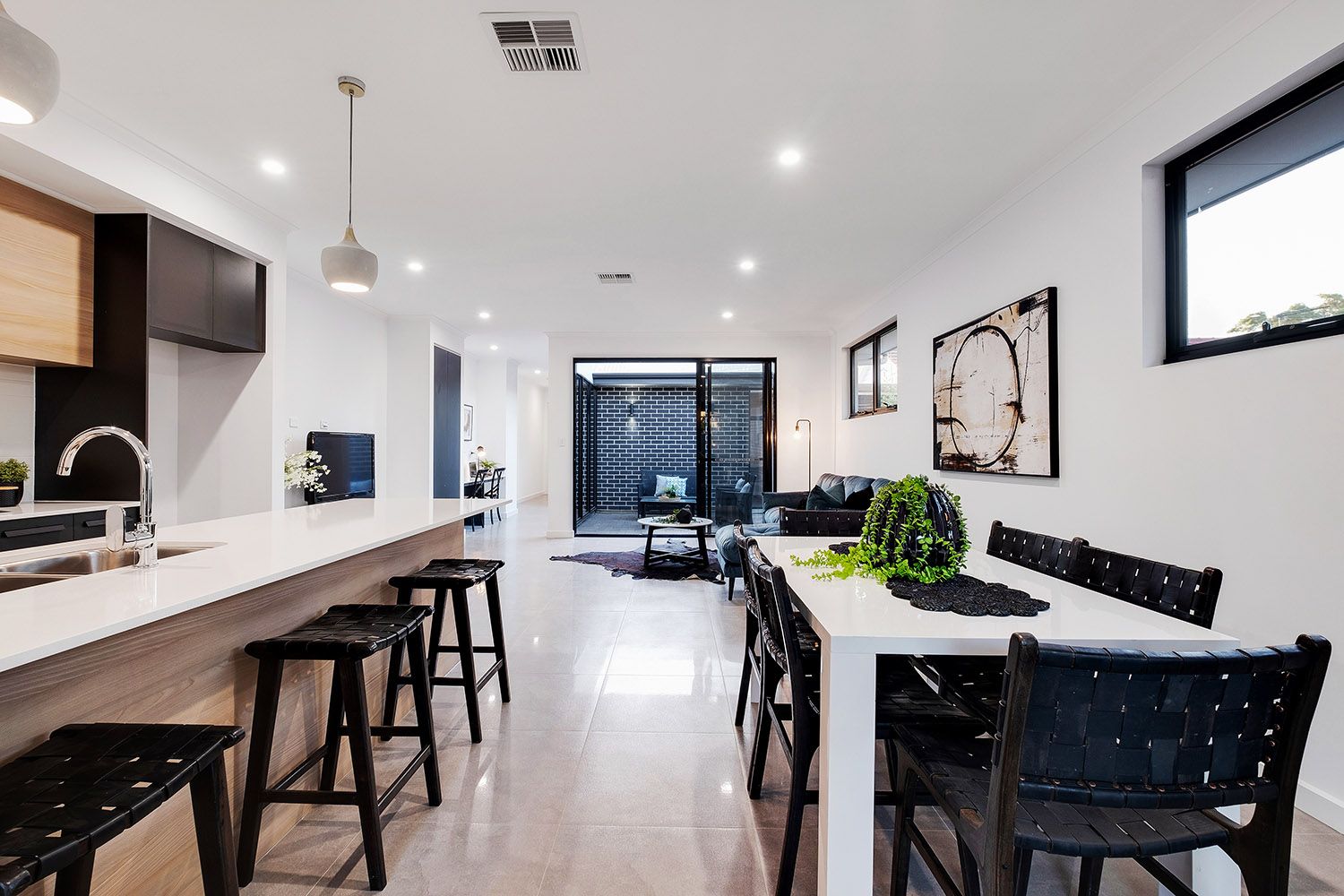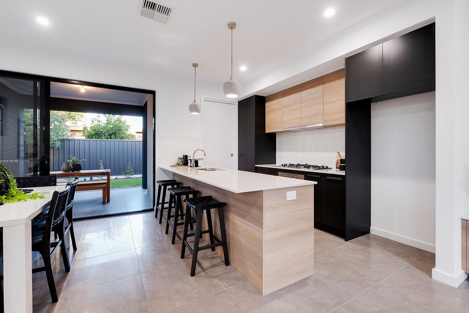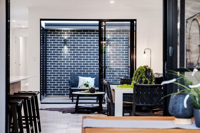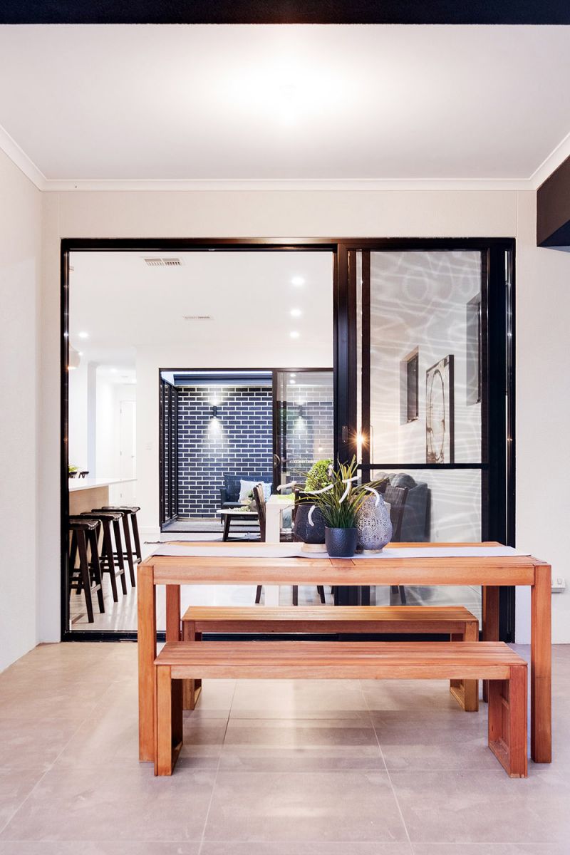 Reaping the benefits of ingenious design, two walls of stacker doors peel back from either side of the living space to connect with the two alfresco areas, providing a seamless flow of extensive entertaining space.