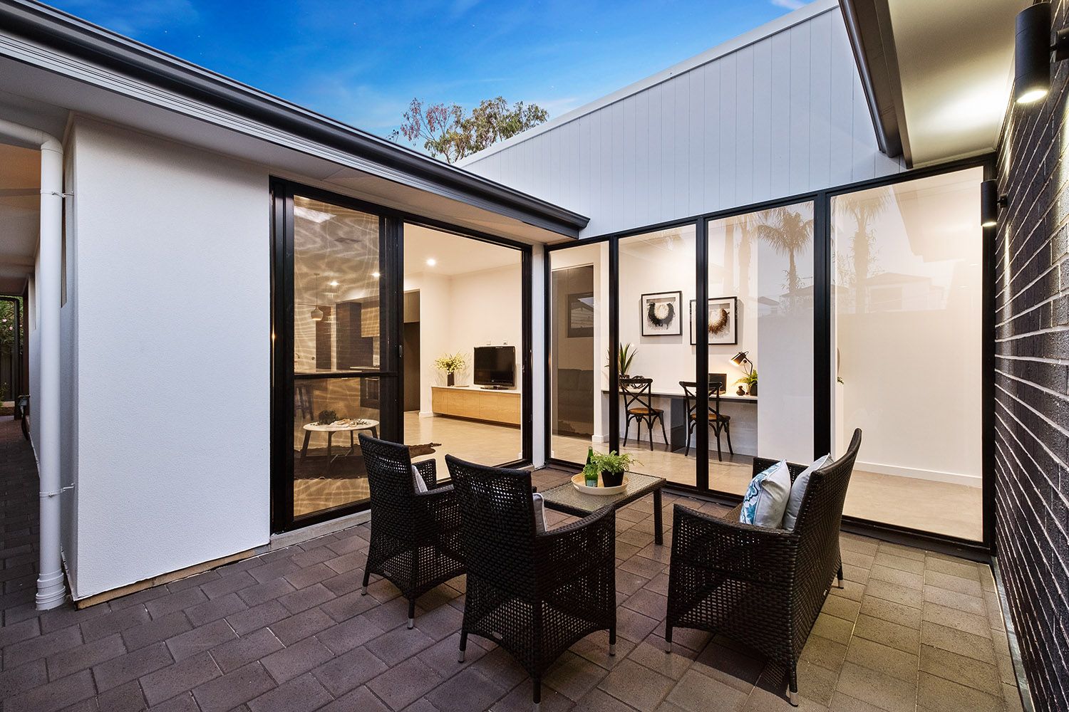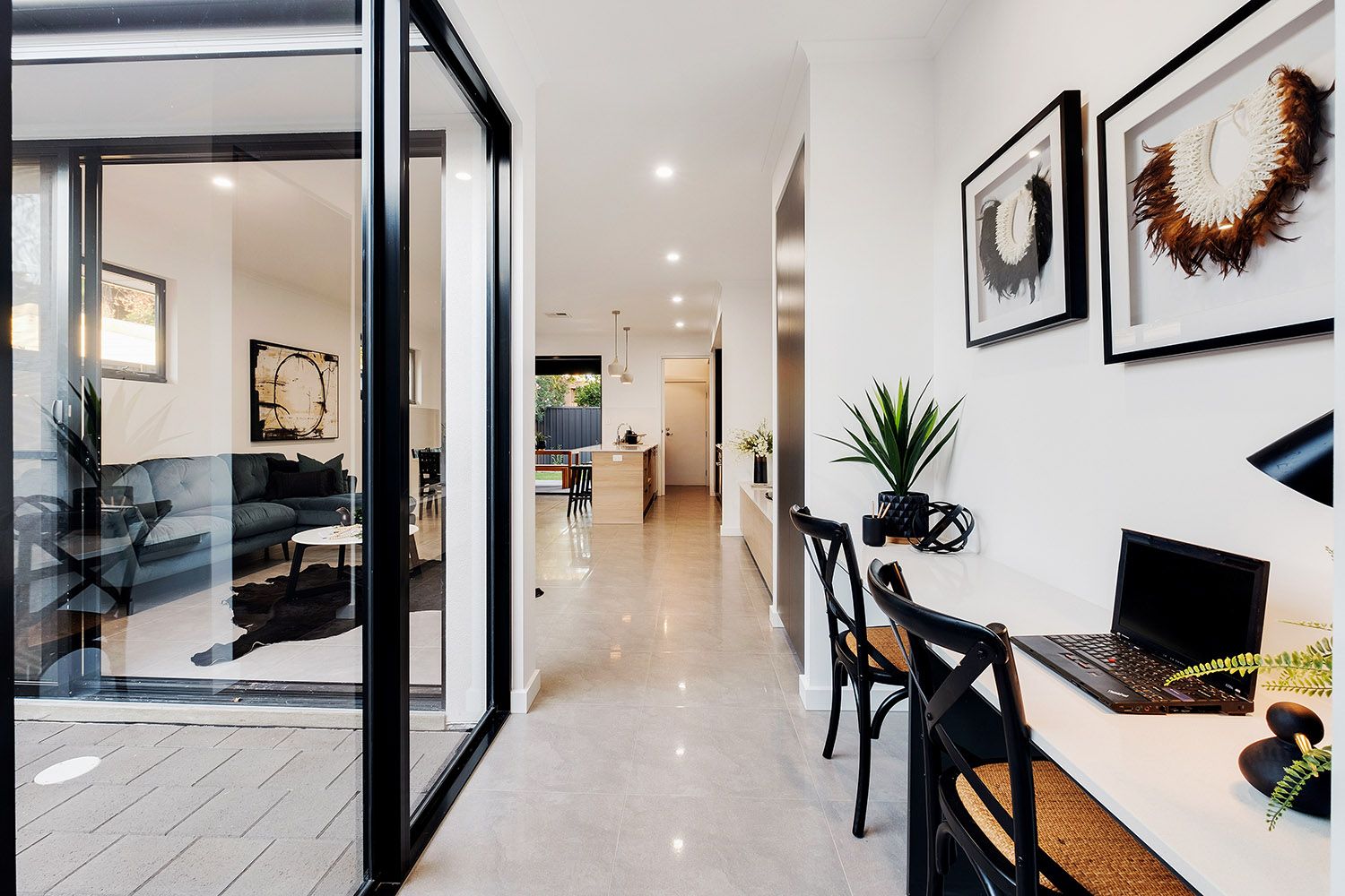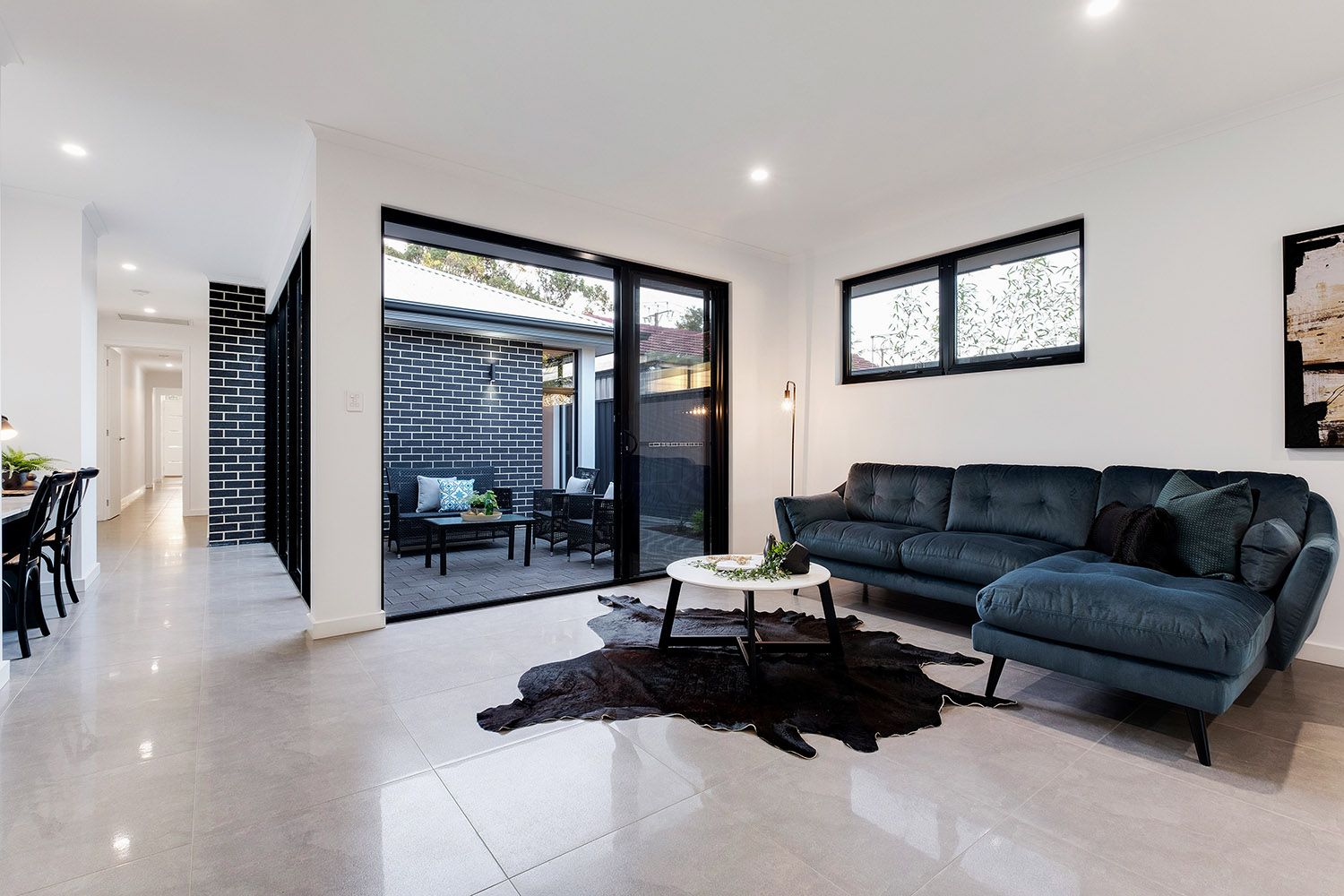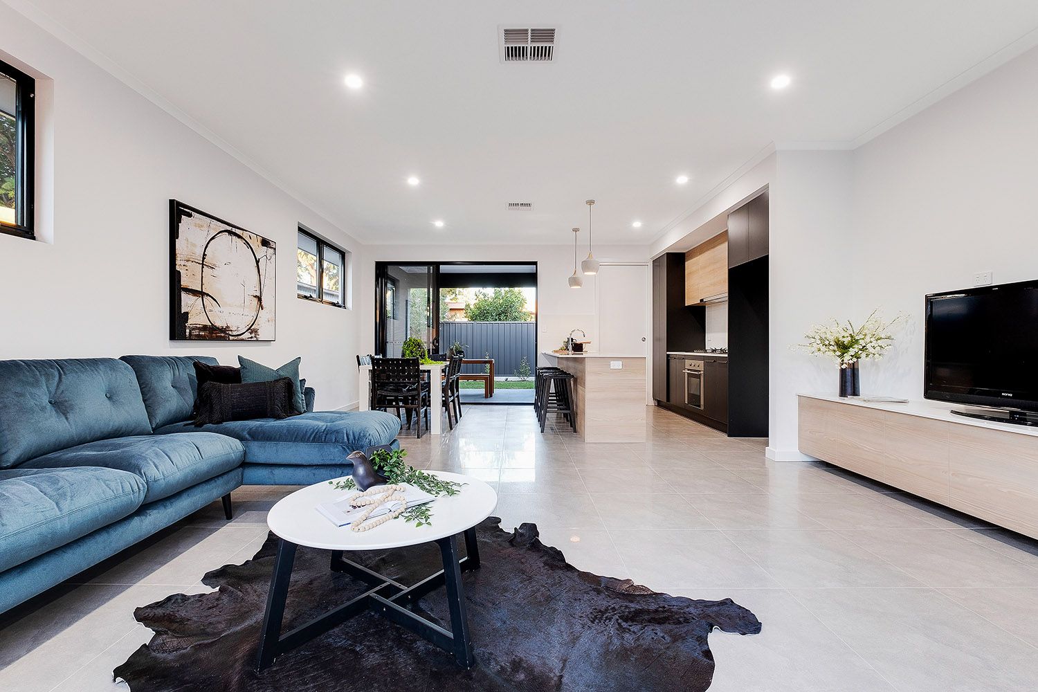Reaping the benefits of ingenious design, two walls of stacker doors peel back from either side of the living space to connect with the two alfresco areas, providing a seamless flow of extensive entertaining space.