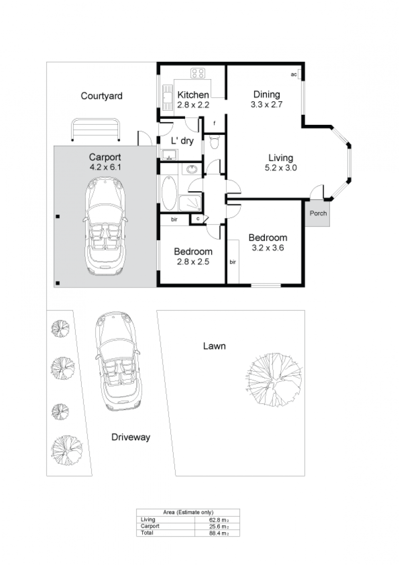 - Carport for parking undercover for 1 car with space in the driveway for your second car.