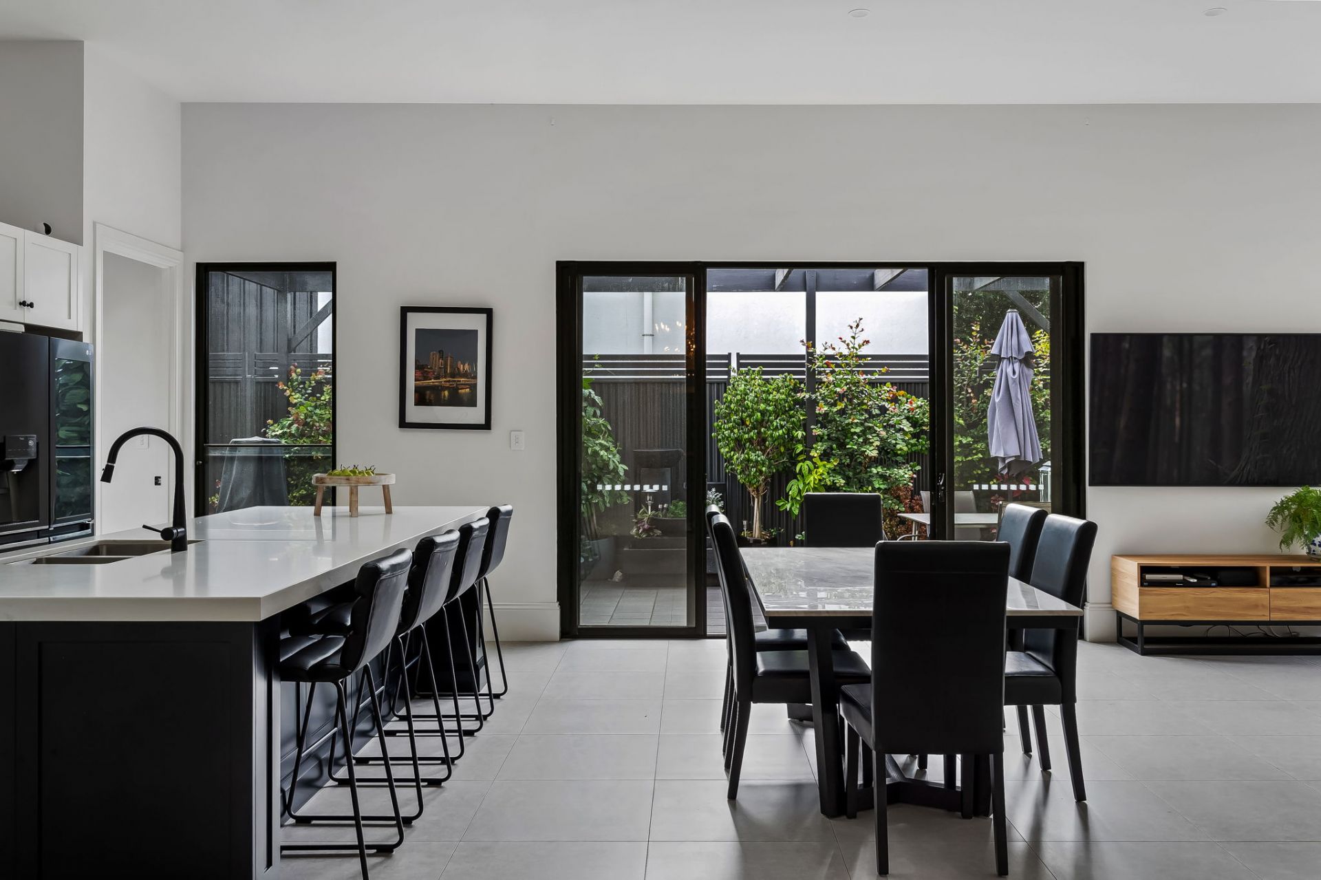 At the rear, soaring 3.3-metre ceilings and full-height double-glazed windows create an open, airy atmosphere filled with natural light. A designer kitchen anchors the heart of the home - with a 1200mm x 3000mm island bench, sleek finishes, and an effortless connection to indoor-outdoor entertaining.