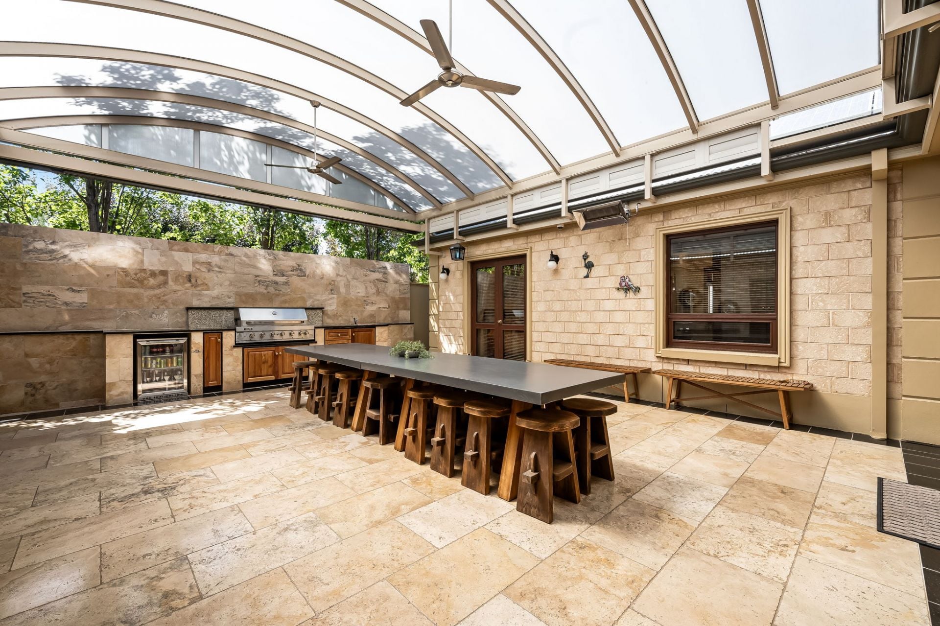 The courtyard is a true highlight, showcasing travertine paving and feature walls, an integrated outdoor kitchen with built-in barbecue, fridge, and granite benchtops, automated awning, gas heaters, and a reversible ceiling fan - delivering an all-season entertaining environment with exceptional privacy.