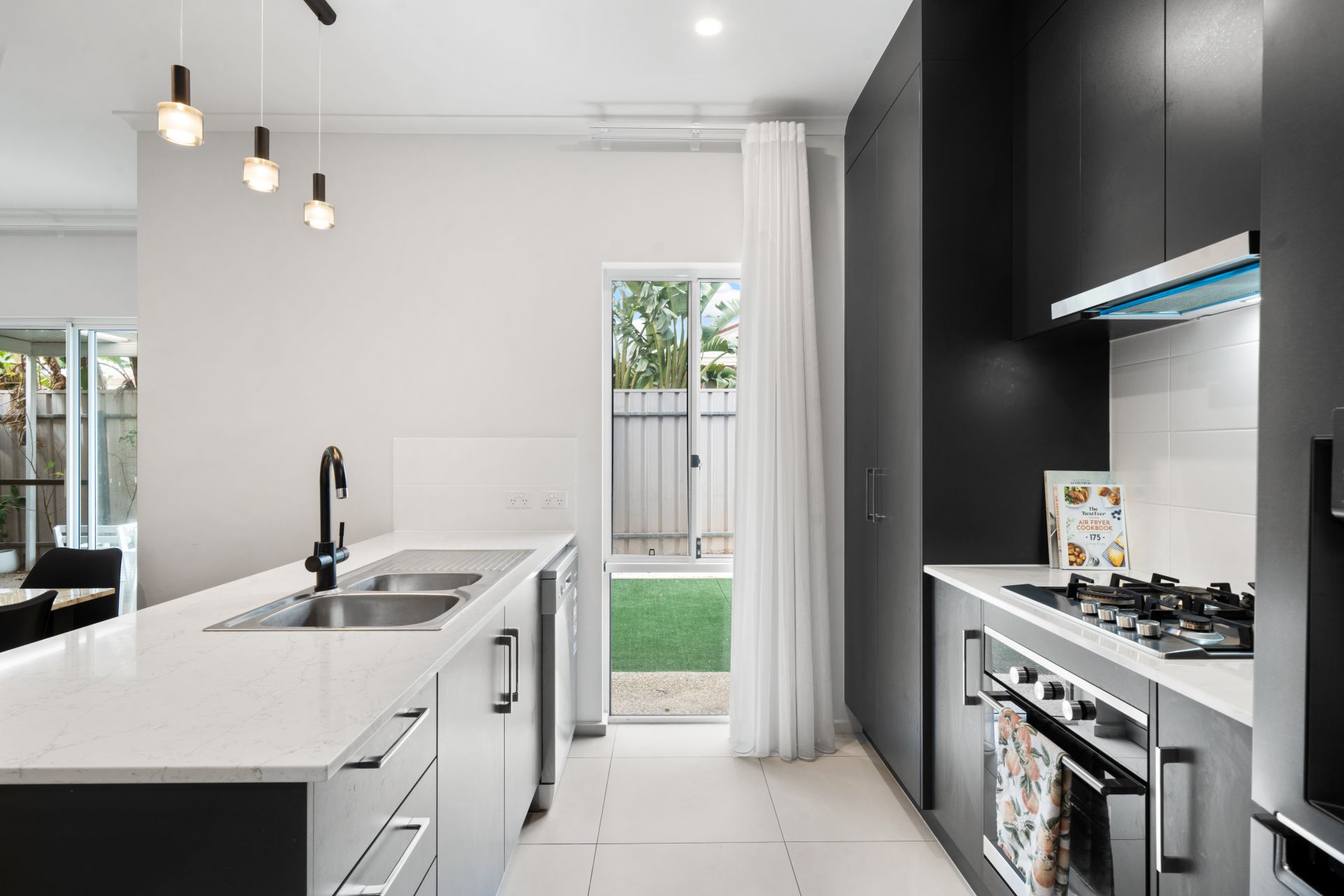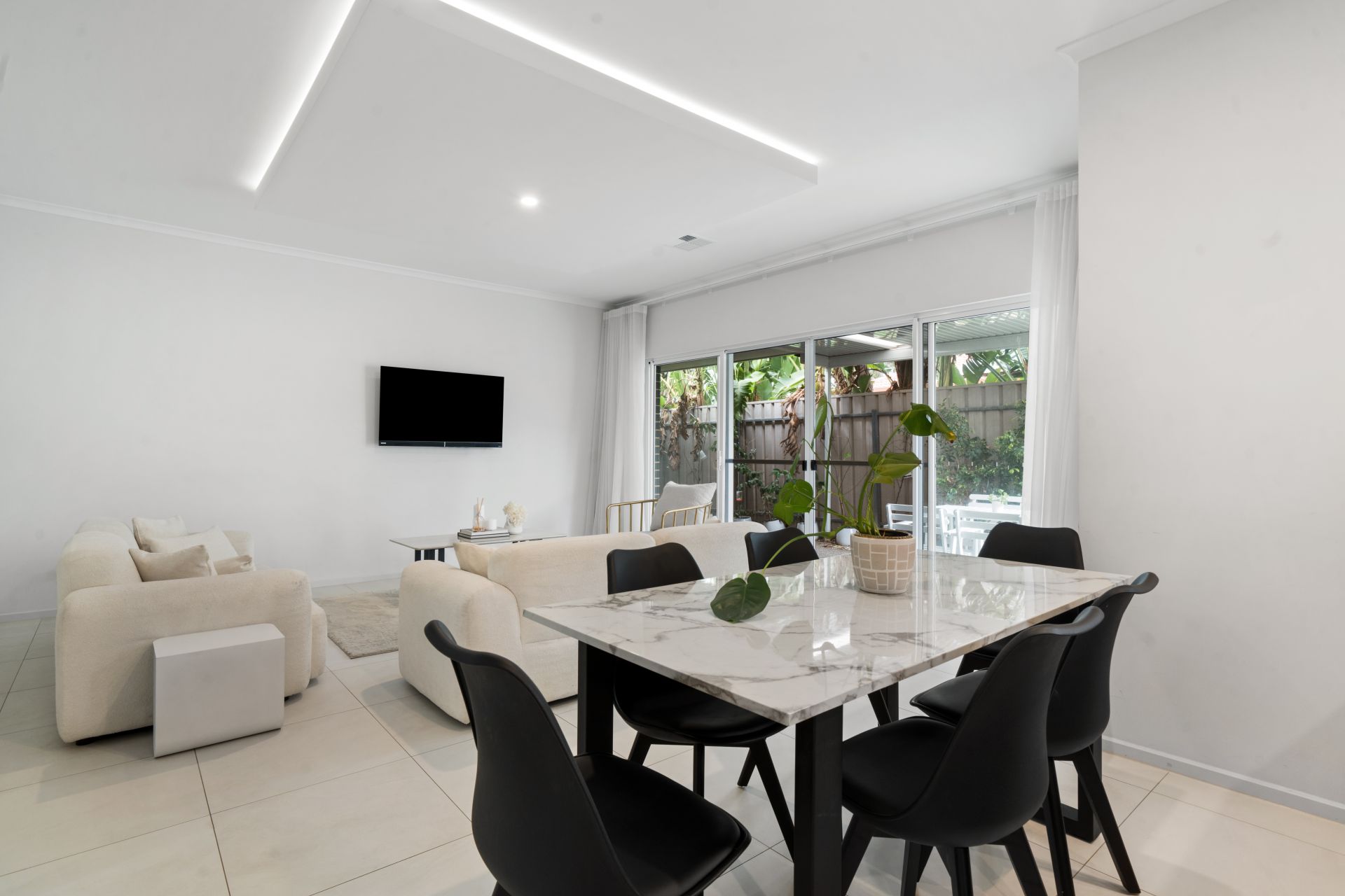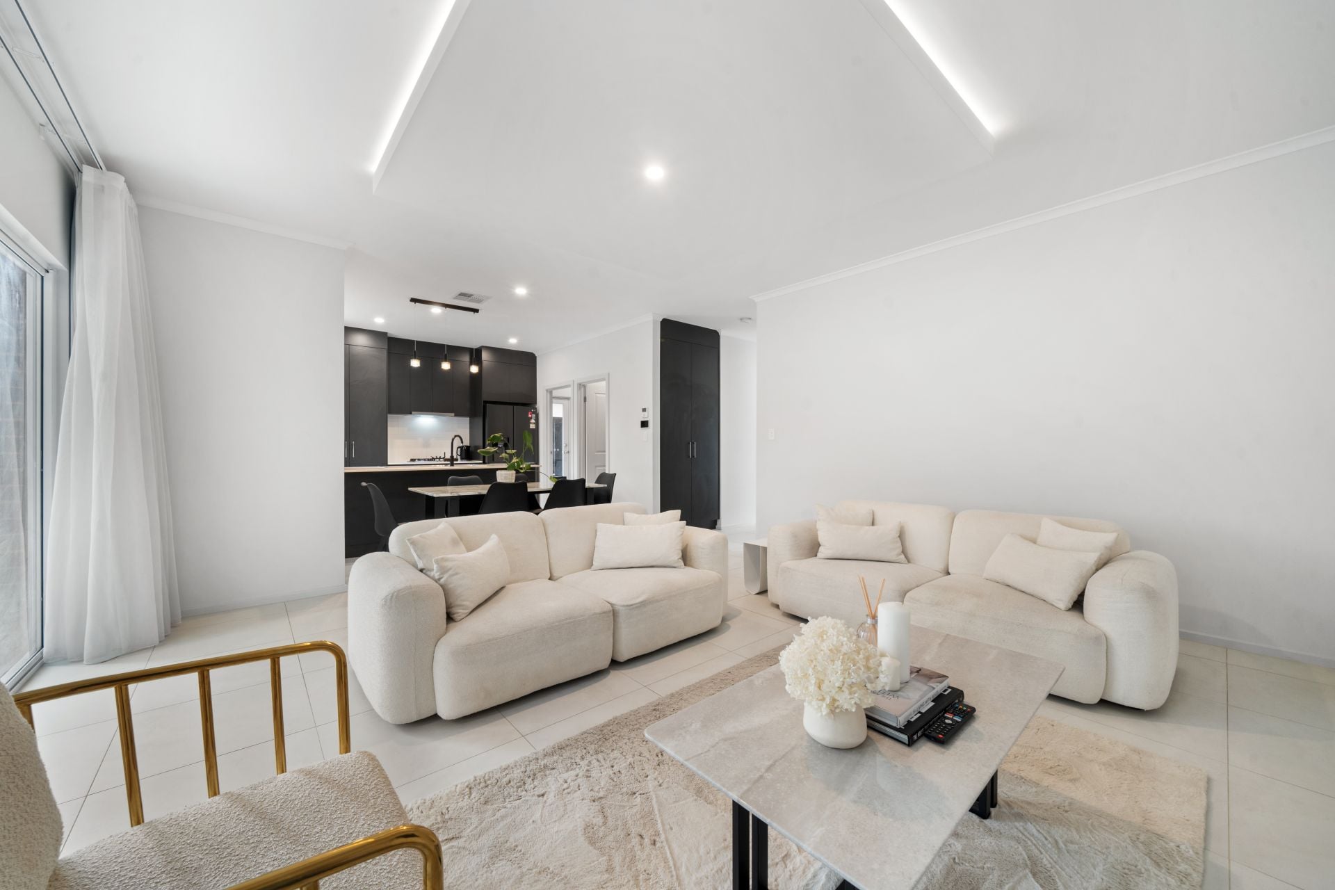 The open plan kitchen, dining and living area is light-filled and enhanced by a stylish drop ceiling feature with LED lighting, creating a warm and modern feel. The kitchen is well appointed with a generous pantry, dual sinks, gas cooktop, electric oven, rangehood and dishwasher and flows through to a spacious, functional laundry. Fixed light fittings and high-end white sheer curtains add a refined finish throughout.
