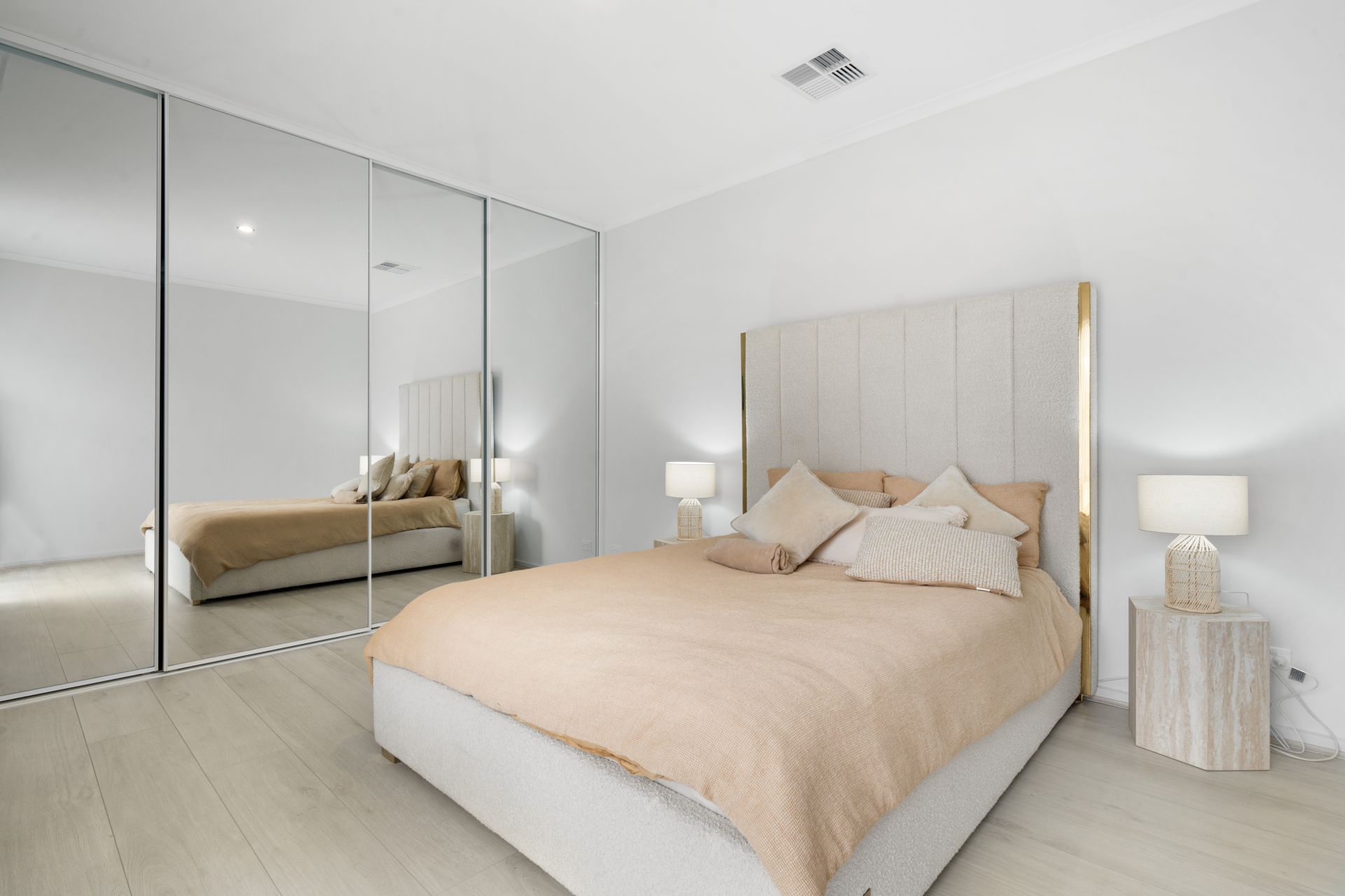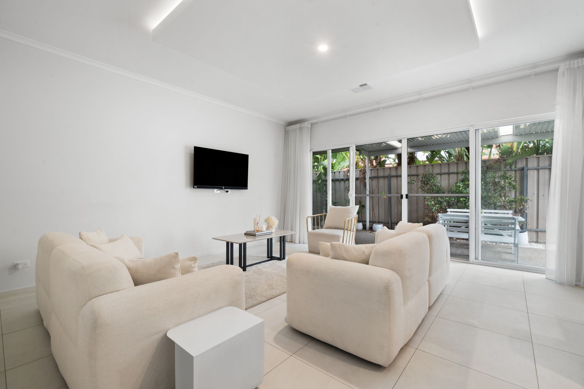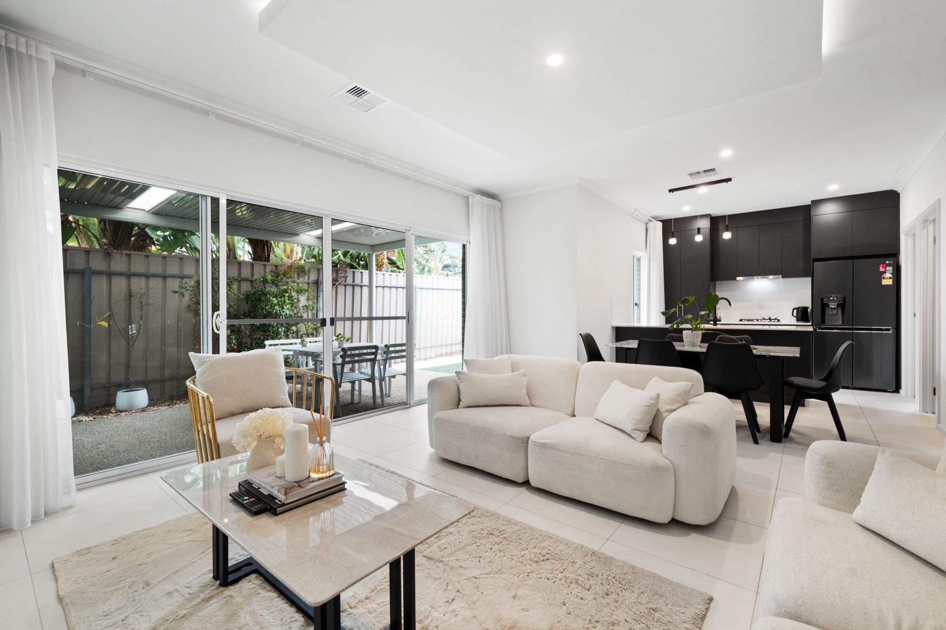 The open plan kitchen, dining and living area is light-filled and enhanced by a stylish drop ceiling feature with LED lighting, creating a warm and modern feel. The kitchen is well appointed with a generous pantry, dual sinks, gas cooktop, electric oven, rangehood and dishwasher and flows through to a spacious, functional laundry. Fixed light fittings and high-end white sheer curtains add a refined finish throughout.