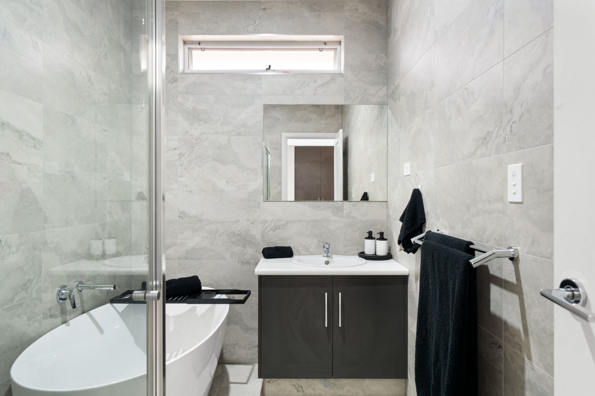 Sliding doors lead out to a covered sunroof alfresco, overlooking a small lawn area that's easy to maintain and perfect for relaxed outdoor living. Comfort is assured year-round with ducted reverse cycle air conditioning throughout, while the central bathroom includes both a shower and bathtub all serviced by an electric hot water system.